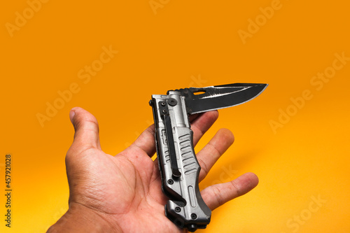 © Jamaludinyusup, Obraz premium Stainless Folding Knife isolated on orange background