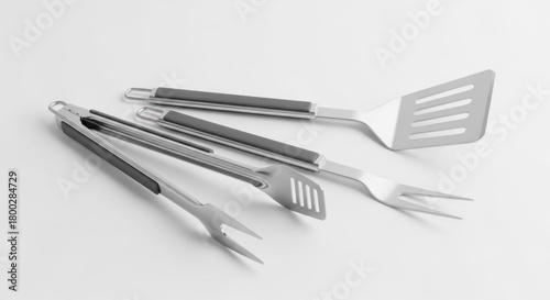 Fototapeta premium Stainless steel barbecue utensils on white, including tongs, spatula, fork,...