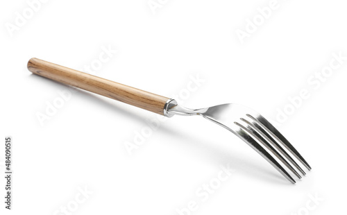 Fototapeta premium Stainless steel fork with wooden handle on white background