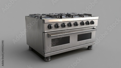 © EKA, Obraz premium Stainless steel gas range with multiple burners and ovens