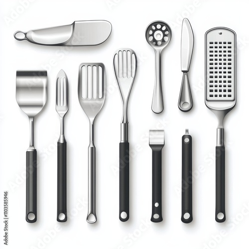 Fototapeta premium Stainless Steel Kitchen Utensil Set Spatulas Grater Grill Tools Cooking...