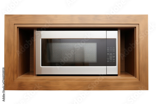 Obraz premium Stainless steel microwave built into wooden kitchen cabinet