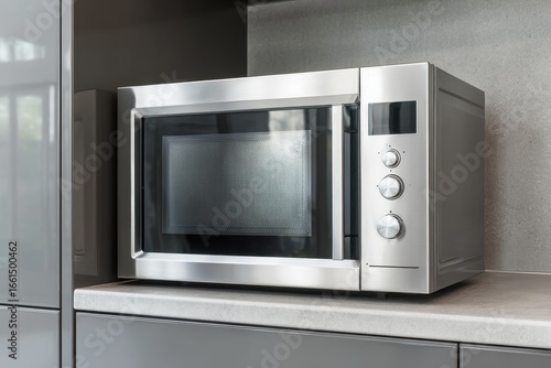 © Mykola, Fototapeta premium Stainless Steel Microwave. Metallic Equipment in Gray Kitchen Interior