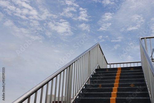 © Boonsawad, Obraz premium Staircase and railing of overhead crosswalk, clouds blue sky background