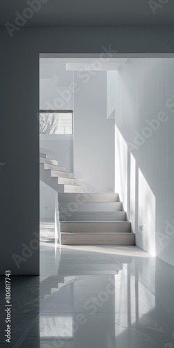 © Molang Visual, Obraz premium Staircase in a modern house with white walls and light wood steps