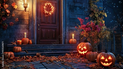 © Alina Young, Obraz premium Stairs decorated with pumpkin from the front door for Halloween