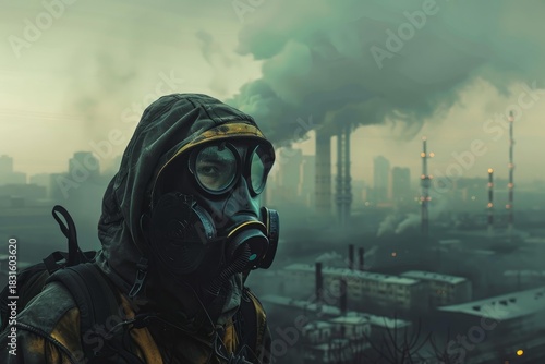 © nsit0108, Obraz premium Stalker wearing a gas mask explores a post apocalyptic urban landscape, shrouded in industrial smog