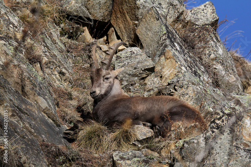 © gabriffaldi, Naklejka premium stambecco (Capra ibex); giovane maschio riposa tra le rocce al sole di dicembre