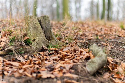 © sharknetjs, Obraz premium Stamm auf Laubboden