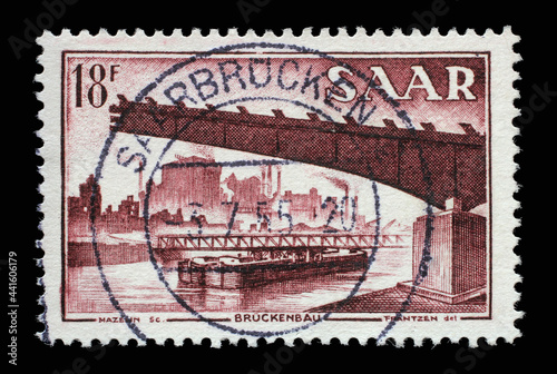 © zatletic, Obraz premium Stamp from Germany area Saar shows Bridge building, population survey, circa 1955