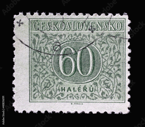 © zatletic, Obraz premium Stamp printed in Czechoslovakia shows Numbers Value, Postage Due Stamps series, circa 1955