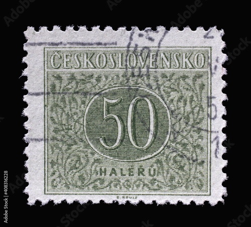 © zatletic, Obraz premium Stamp printed in Czechoslovakia shows Numbers Value, Postage Due Stamps series, circa 1955