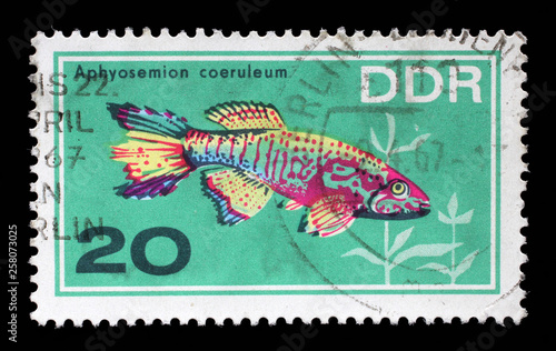 © zatletic, Naklejka premium Stamp printed in the DDR (East Germany) shows Aquarium Fish Aphyosemion coeruleum, circa 1966.