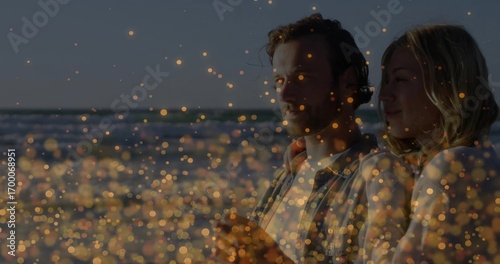 Fototapeta premium Standing couple gazing on sandy beach at dusk, with golden bokeh lights, copy...