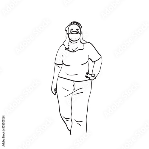 © a3701027, Fototapeta premium standing fat woman with medical mask illustration vector hand drawn isolated on white background line art.