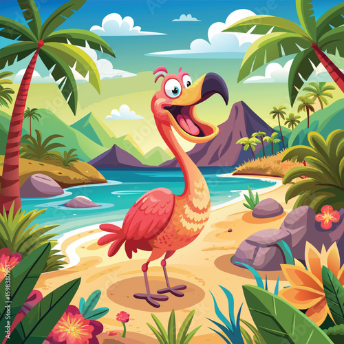 Obraz premium Standing Flamingo Bird Near Island Shoreline Vector