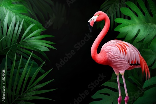Fototapeta premium Standing in a lush tropical jungle is a pink flamingo.