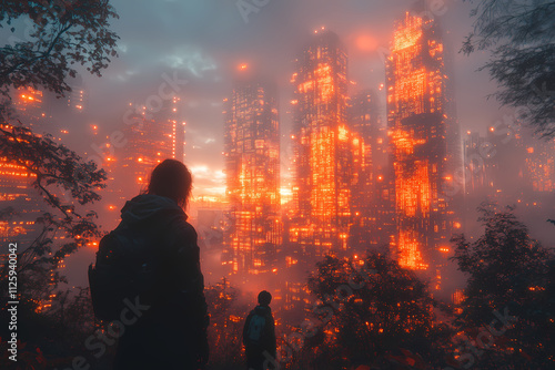 © Akharadat, Fototapeta premium Standing in the city, a group of young people gazed at the towering skyscrapers made completely from data and code.