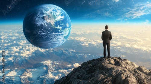 Fototapeta premium Standing on a mountain peak, a man watches as the earth ascends above the clouds in an otherworldly sky