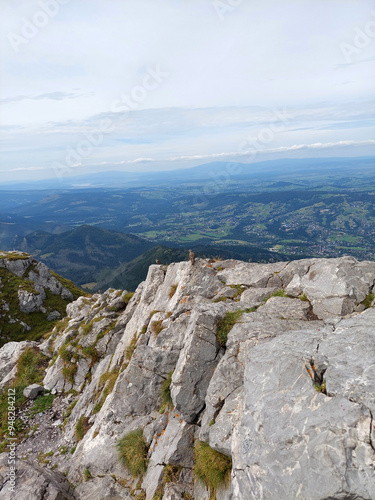 Fototapeta premium Standing on a rocky mountain peak with a view of distant mountains and valleys below