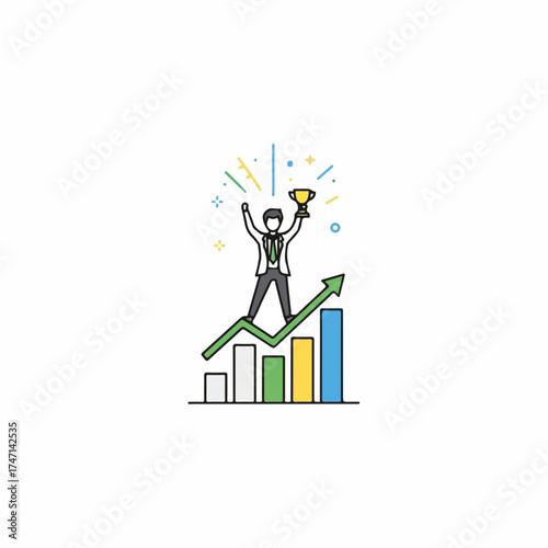 Obraz premium Standing on rising graph, celebrating victory with golden trophy shows business success. Business success, illustrated by rising chart with cheerful character holding gold cup.