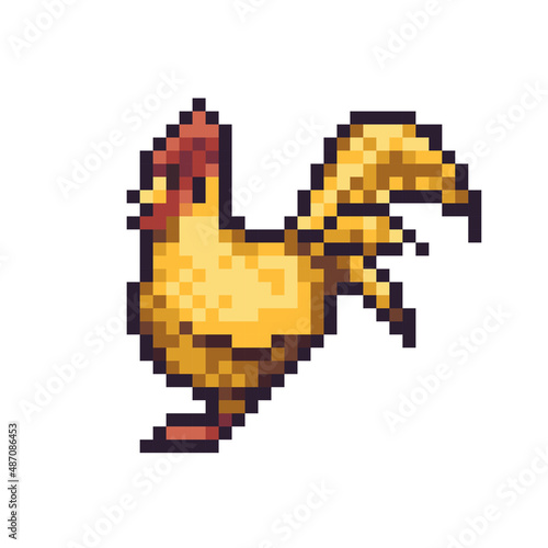 Fototapeta premium Standing rooster pixel art icon. Chicken, farm bird. Country character logo. Game development, mobile app. 8-bit sprite. Isolated vector illustration