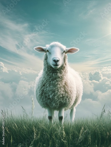 © Dzikrul Husnani, Fototapeta premium Standing Sheep in Grassy Field with Sky and Clouds Background