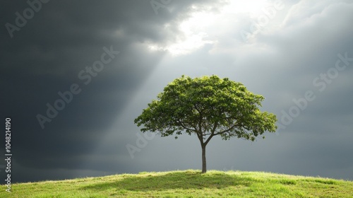 © Jakkarin, Obraz premium Standing Tall: Resilience of a Lone Tree Against Dark Storm Clouds in Ultra-Detailed Shot