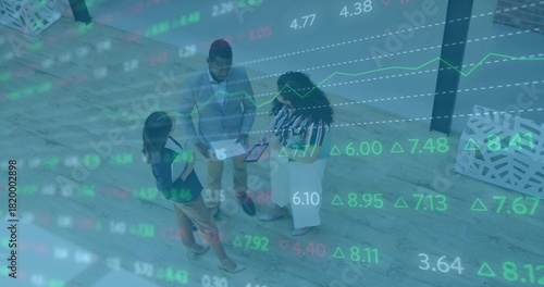 Obraz premium Standing three staff in suits reviewing tablet, folder on wood floor, planter and market overlay