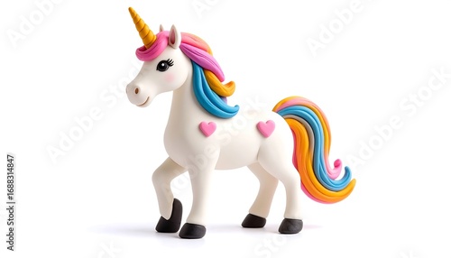 © Liayja, Fototapeta premium Standing Unicorn Figurine with Colorful Mane and Hearts