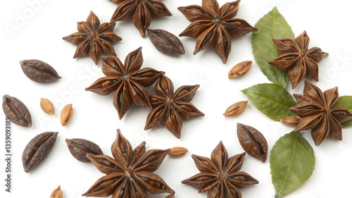 Fototapeta premium Star anise spice fruits and seeds isolated on white background closeup