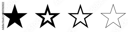 Obraz premium Star icon. Five-pointed star: black silhouette and outline lines, isolated on a white background. Four style variations. Vector illustration.