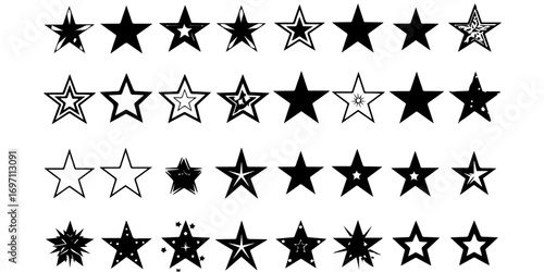 © T25T, Naklejka premium Star Illustrations Set | Black and White Star Designs, Grunge Retro Star Vector Pack, Geometric Star Icons, Decorative Star Clipart Collection