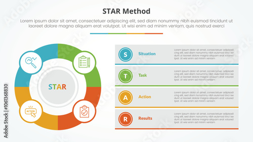 © fatmawati, Naklejka premium STAR method infographic concept for slide presentation with big outline circle and box description stack with 4 point list with flat style