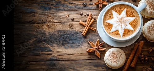 © Vergiliy, Fototapeta premium Star-shaped latte art on coffee with spices and macarons on rustic wooden table, copy space for text