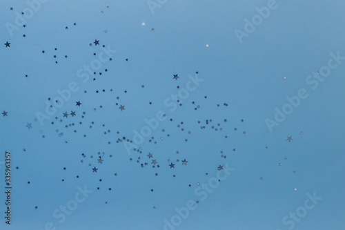 Fototapeta premium Star shaped silver sequins over classic blue background. Copy space.Holiday background for a greeting card. Top view, holiday concept.