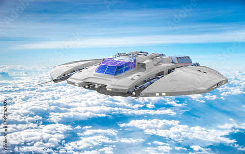 © DM7, Fototapeta premium star ship flying above the clouds side view