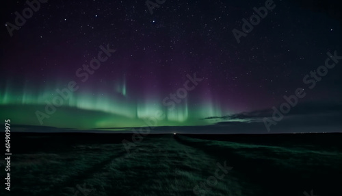 Fototapeta premium Star trail illuminates majestic mountain range in vibrant multi colored landscape generated by AI