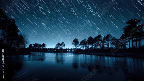 Fototapeta premium Star trails streak across the night sky above a calm lake, framed by...