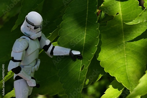© zayacsk, Fototapeta premium Star Wars action figure of Clone trooper touching large leaf of Japanese Elm, also called keyaki or keaki, latin name Zelkova Serrata, partially sunlit by spring daylight sunshine.