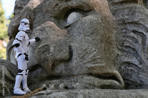 Fototapeta premium Star Wars articulated action figure of Clone Trooper examining large stone statue of sleeping lion.