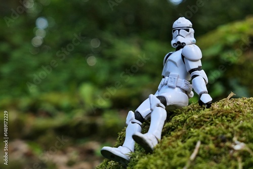© zayacsk, Fototapeta premium Star Wars articulated action figure of Clone Trooper soldier in white armor, sitting relaxed on mossy stone in shadow of spring foliage.