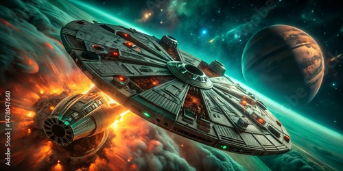 © urooj, Fototapeta premium Star Wars Millennium Falcon Flying Through Nebula HD Spacecraft in Starry Sky Sci-Fi Artwork for Digital Collectors