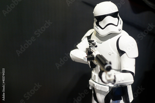 Naklejka premium Star Wars Stormtrooper figures on display shelf in Ximending Mall, Taipei. Star Wars is an American epic space opera franchise, film series created by George Lucas. TAIPEI, TAIWAN - JUNE 26, 2018.