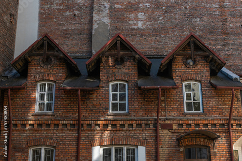 © smoku7979, Fototapeta premium Stara zabytkowa kamienica w centrum warszawy na ulicy Hożej o nietypowym kształcie z czerwonej cegły.