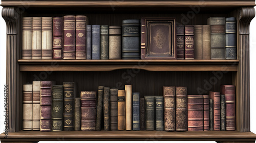 Naklejka premium Stare książki, starannie poukładane na półkach, stoją w cichym kącie biblioteki. Każda książka z zarysowanymi grzbietami i złotymi napisami przyciąga wzrok, tworząc eleganckie i klasyczne wnętrze.