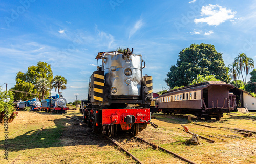© vadim.nefedov, Naklejka premium Stare pociągi i wagony retro stalowe lokomotywy stojące na szynach w Livingstone w Zambii