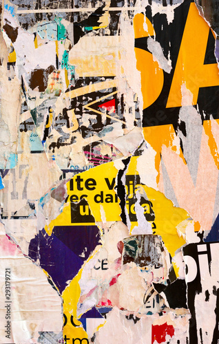 © Nikola, Fototapeta premium Stare zgrane podarte plakaty grunge tekstury tła pognieciony zmięty papier tło plakatu powierzchnia / miejskie plakaty uliczne
