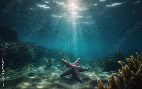 Fototapeta premium Starfish at the bottom of the ocean. Marine life. Ai Generative