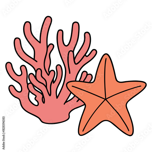 Naklejka premium Starfish beside coral illustration with black outline